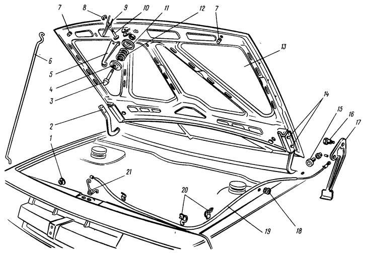 Капот 13 навешивается на петли 2 по заднему краю. Увеличенные отверстия в кронштейнах для петель допускают регулировку положения капота в проеме кузова. Капот опирается на резиновые буфера 7. В передней части капота устанавливаются замок капота с крючком 5, предохраняющим самопроизвольное открытие капота. Крючок поджимается пружиной 9. Привод замка тросовый, рукоятка замка располагается в салоне с левой стороны под панелью приборов. Рукоятка соединяется тягой в оболочке 19 с пружиной 21, фиксирующей капот за штырь 3 в закрытом положении. Штырь завернут в капот и закреплен контргайкой. Изменением положения штыря регулируется положение капота по отношению лицевых поверхностей передних крыльев и облицовки радиатора. На штырь устанавливаются чашки 4 и 11 с пружиной 12 между ними. В открытом положении капот удерживается металлическим упором 6. Концы упоров устанавливаются в пластмассовые втулки 1.