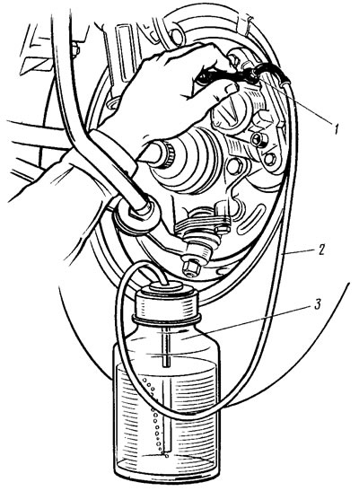 Надевают на головку штуцера 1 (рис. 114) резиновый шланг 2 для слива жидкости, а его свободный конец опускают в прозрачный сосуд 3, частично заполненный жидкостью. Резко нажав на педаль тормоза 3—5 раз с интервалами 2—3 с, отвертывают на 1/2—3/4 оборота штуцер при нажатой педали. Продолжая нажимать на педаль, вытесняют находящуюся в системе жидкость вместе с воздухом через шланг в сосуд. После того как педаль тормоза достигнет переднего крайнего положения и истечение жидкости через шланг прекратится, завертывают штуцер выпуска воздуха до отказа. Повторяют эти операции до тех пор, пока не прекратится выход пузырьков из шланга.