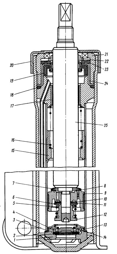 Рис. 83. Телескопическая стойка: 1 - корпус клапана сжатия; 2 - диски клапана сжатия; 3 - дроссельный диск клапана сжатия; 4 - тарелка клапана сжатия; 5 - пружина; 6 - тарелка клапана отдачи; 7 - пружина перепускного клапана; 8 - тарелка перепускного клапана; 9 - поршень с кольцом; 10 - дроссельный диск клапана отдачи; 11 - диски клапана отдачи; 12 - гайка клапана отдачи; 13 - обойма клапана сжатия; 14 - пружина; 15 - плунжер; 16 - пружина плунжера; 17 - направляющая втулка штока со сливной трубкой; 18 - уплотнительное кольцо; 19 - сальник; 20 - опора буфера сжатия; 21 - гайка корпуса; 22 - защитное кольцо штока; 23 - уплотнительное кольцо резервуара; 24 - обойма сальника; 25 - шток |