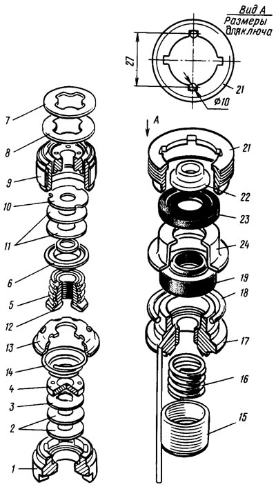 Рис. 84. Детали клапанов и уплотнения телескопической стойки. Цифровые обозначения соответствуют рис. 83 |