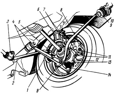Нижняя часть поворотного кулака 12 (рис. 85) соединяется шаровым шарниром 13 с поперечным рычагом 1 подвески. Тормозные и тяговые силы воспринимаются продольными растяжками 8, которые через резинометаллические шарниры соединяются с поперечными рычагами 1 и с кронштейнами 10. В местах соединения растяжки с рычагом и с кронштейном устанавливаются регулировочные шайбы 9, которыми регулируется угол продольного наклона оси поворота. В поворотном кулаке установлен двухрядный радиально-упорный подшипник закрытого типа, на внутренних кольцах которого установлена с натягом ступица 2 (см. рис. 81). Подшипник затягивается гайкой на хвостовике корпуса наружного шарнира привода колеса и не регулируется. Все гайки передних и задних ступиц колес одинаковые и имеют правую резьбу.