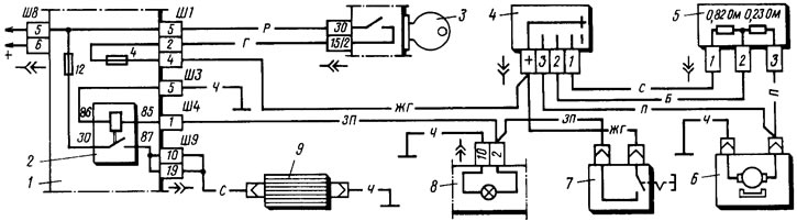 Рис. 152. Схема включения электродвигателя отопителя и элемента обогрева заднего стекла: 1 - монтажный блок (фрагмент); 2 - реле включения обогрева заднего стекла; 3 - выключатель зажигания (фрагмент); 4 - переключатель электродвигателя отопителя; 5 дополнительный резистор; 6 - электродвигатель отопителя; 7 - выключатель обогрева заднего стекла; 8 - комбинация приборов с контрольной лампой обогрева заднего стекла (фрагмент); 9 - элемент обогрева заднего стекла