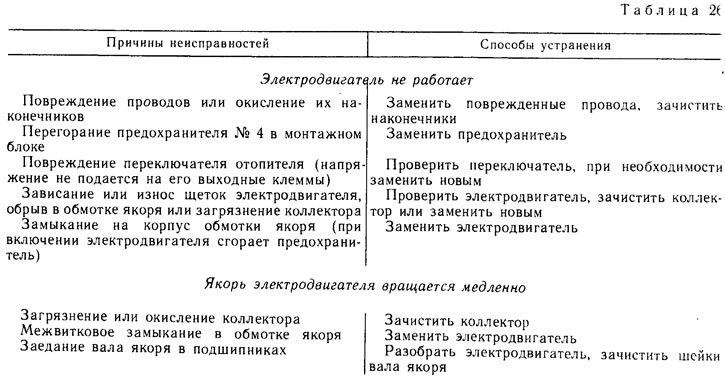 Возможные неисправности электродвигателя вентилятора отопителя, их причины и способы устранения приведены в табл. 26.