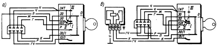 Рис. 142. Схема соединений выключателя зажигания без реле (а) и с дополнительным реле зажигания (б)