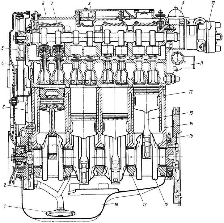 Рис. 2. Продольный разрез двигателя: 1 - приемник масляного насоса; 2 - масляный насос; 3 - насос охлаждающей жидкости; 4 - зубчатый ремень привода распределительного вала и насоса охлаждающей жидкости; 5 - головка цилиндров; 6 - крышка iоливки цилиндров; 7 - распределительный вал; 8 - маслоотделитель системы вентиляции картера; 9 - топливный насос; 10 - датчик-распределитель зажигания; 11 - отводящий патрубок охлаждающей рубашки; 12 - поршень; 13 - шатун; 14 - блок цилиндров; 15 - маховик; 16 - коленчатый вал; 17 - крышка коренного подшипника; 18 масляный картер