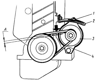 Нормальный прогиб А (рис. 51) ремня должен быть в пределах 8—10 мм при усилии 10 кгс. Для регулировки натяжения ремня 4 отпускают гайку 1 крепления генератора 3 к натяжной планке 2. Смещают генератор в сторону от двигателя (для увеличения натяжения) или к двигателю (для уменьшения натяжения) и затягивают гайку /. Поворачивают коленчатый вал на два оборота по часовой стрелке и проверяют натяжение ремня.