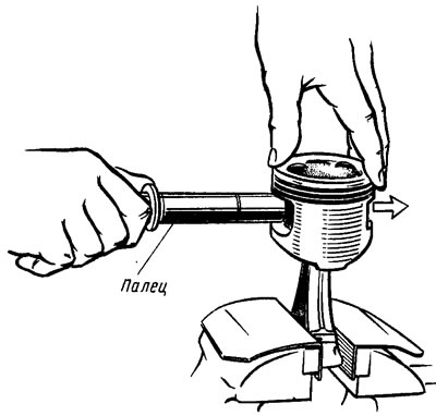 Перед сборкой подбирают палец к поршню. Для правильного сопряжения необходимо, чтобы поршневой палец, смазанный моторным маслом, входил в отверстие поршня от простого нажатия большого пальца руки и не выпадал из него, если держать поршень с поршневым пальцем в вертикальном положении. Выпадающий палец заменяют другим, следующей категории (см. «Особенности устройства» в этой же главе). Если в поршне был палец третьей категории, то заменяют поршень с поршневым пальцем.