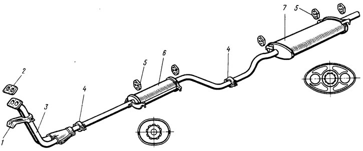 Для снятия дополнительного глушителя 6 рассоединяют передний и задний хомуты 4. Вынимают уплотнительные кольца и снимают глушитель с подвесок.