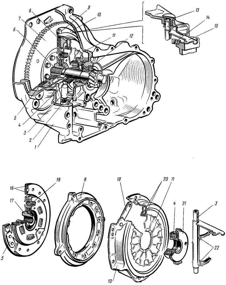 Рис. 57. Сцепление в сборе: 1 - картер сцепления; 2 - опорная втулка вала вилки выключения сцепления; 3 - вилка выключения сцепления; 4 - подшипник выключения сцепления; 5 - ведомый диск; 6 - первичный вал коробки передач; 7 - маховик; 8 нажимной диск; .9 - болт крепления сцепления к маховику; 10 - кожух сцепления; 11 - нажимная пружина; 12 - подшипник первичного вала; 13 - втулка вала вилки выключения сцепления; 14 оттяжная пружина рычага вилки выключения сцепления; 15 - рычаг вилки выключения сцепления; 16 - фрикционные накладки; 17 - ступица ведомого диска; 18 - пружина демпфера; 19 - пластина, соединяющая кожух сцепления с нажимным диском; 20 - опорные кольца нажимной пружины; 21 - муфта подшипника выключения сцепления; 22 - соединительная пружина вилки и муфты подшипника выключения сцепления