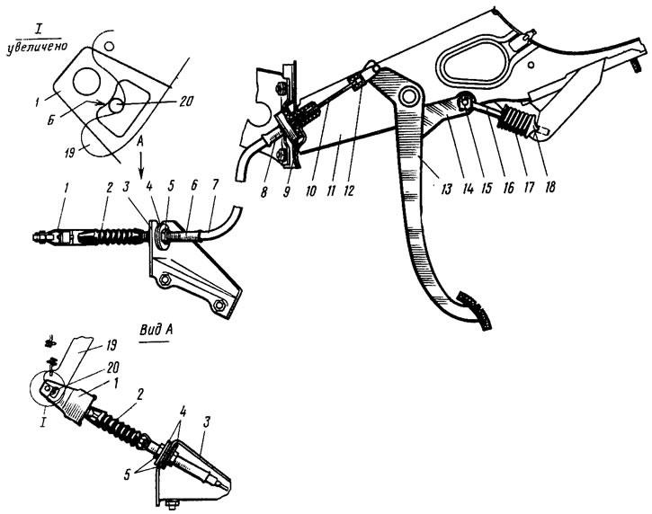 Привод выключения сцепления механический с пружинным усилителем (сервомеханизмом). Педали сцепления и тормоза подвешены на общей оси к кронштейну 11 (рис. 58). К педали 13 сцепления приварен рычаг 14 усилителя, который шарнирно соединяется с толкателем 16. Конец толкателя закреплен скобой 15. На конце толкателя между опорной шайбой и опорой 18 установлена предварительно сжатая пружина 17. Опора 18 упирается в гнездо кронштейна, приваренного к кронштейну педалей. Верхняя часть педали соединяется с серьгой 12 троса привода сцепления. Нижний наконечник 6 оболочки 7 троса зажат в гнезде кронштейна 3 двумя регулировочными гайками 5 с шайбами 4. На нижнем конце троса крепится поводок 1, который пальцем соединяется с рычагом 19 вилки выключения сцепления. Нижний конец троса закрыт чехлом 2. Верхний наконечник 8 оболочки троса 10 расположен в резиновом буфере 9, который торцом упирается в гнездо передка кузова.