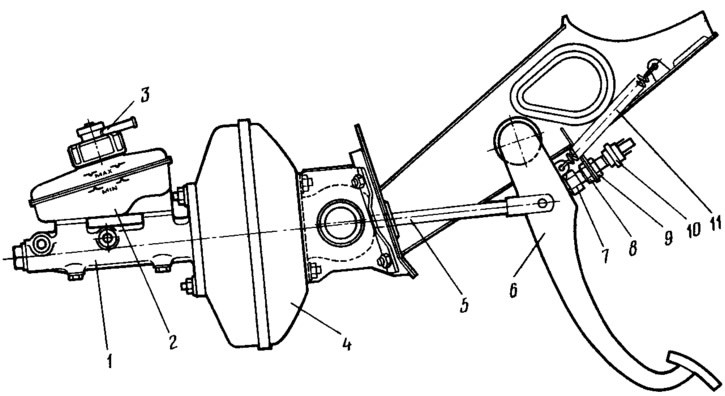 1 - главный цилиндр; 2 - бачок; 3 - датчик аварийного уровня жидкости; 4 - вакуумный усилитель; 5 - толкатель; 6 - педаль тормоза; 7 - буфер выключателя стоп-сигнала; 8, 9 - гайки крепления стоп-сигнала; 10 - выключатель стоп-сигнала; 11 - возвратная пружина педали.