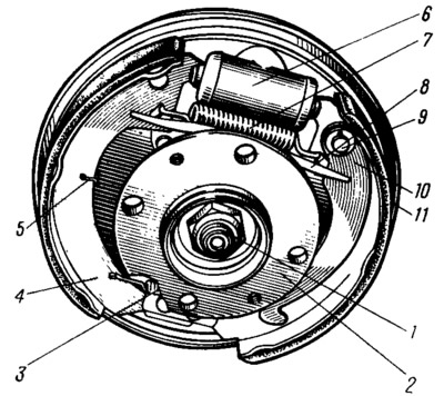 1 - гайка крепления ступицы; 2 - ступица колеса; 3 - нижняя стяжная пружина колодок; 4 - тормозная колодка; 5 - направляющая пружина; 6 - колесный цилиндр; 7 - верхняя стяжная пружина; 8 - разжимная планка; 9 - палец рычага привода стояночного тормоза; 10 - рычаг ручного привода колодок; 11 - шит тормозного механизма.