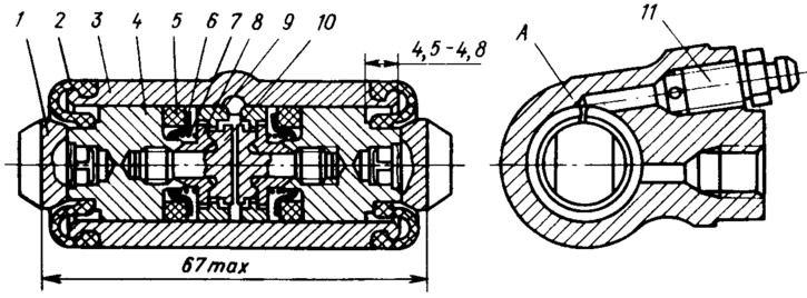 1 - упор колодки; 2 - защитный колпачок; 3 - корпус цилиндра; 4 - поршень; 5 - уплотнитель; 6 - опорная тарелка; 7 - пружина; 8 - сухари; 9 упорное кольцо; 10 - упорный пинт; 11 - штуцер; А - прорезь на упорном кольце.
