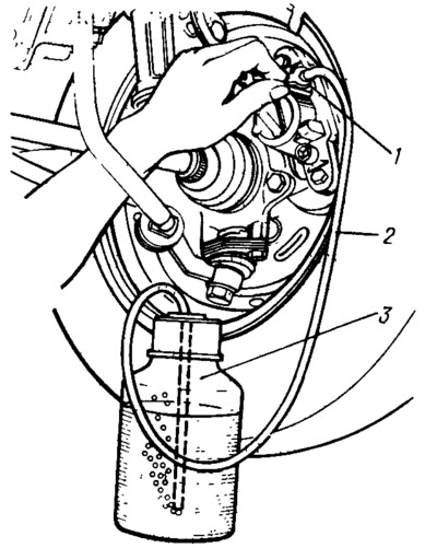 - надеть на головку штуцера 1 (рис. 90) резиновый шланг 2 для слива жидкости, а его свободный конец опустить в прозрачный сосуд 3, частично заполненный жидкостью;