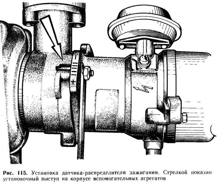 Для удобства регулировки момента зажигания на фланце датчика-распределителя зажигания имеются деления и знаки «+» и «—», а на корпусе вспомогательных агрегатов — установочный выступ (рис. 115). Одно деление на фланце соответствует восьми градусам поворота коленчатого вала.