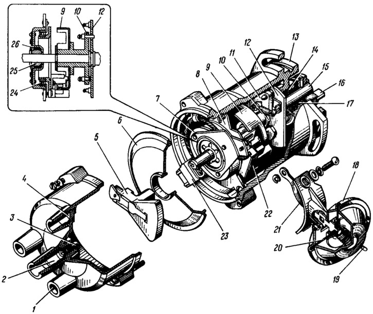 1 - крышка; 2 - клемма для провода от катушки зажигания; 3 - центральный угольный электрод; 4 - боковой электрод с клеммой; 5 - ротор; 6 - защитный экран; 7 - держатель переднего подшипника валика; 8 - опорная пластина датчика; 9 - экран; 10 - ведомая пластина центробежного регулятора; 11 - грузик; 12 - ведущая пластина; 13 - корпус датчика-распределителя зажигания; 14 - сальник; 15 - валик; 16 - муфта; 17 - втулка заднего конца валика; 18 - корпус вакуумного регулятора; 19 - штуцер для подвода разрежения; 20 - диафрагма; 21- тяга вакуумного регулятора; 22 - бесконтактный датчик; 23 - колодка штекерного разъема; 24 - подшипник опорной пластины датчика; 25 - втулка переднего конца валика; 26 - войлочное кольцо.