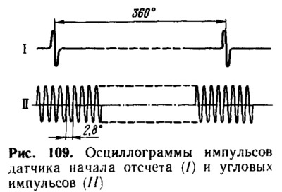 Импульсы, генерируемые датчиками НО и УИ, показаны на рис. 109. Амплитуда импульсов напряжения составляет от 0,2 до 100 В в диапазоне частот вращения коленчатого вала от 25 до 6000 об/мин. Зазор между сердечником датчика и вершиной зуба венца маховика или торцом маркерного штифта должен быть 0,3...1,2 мм.