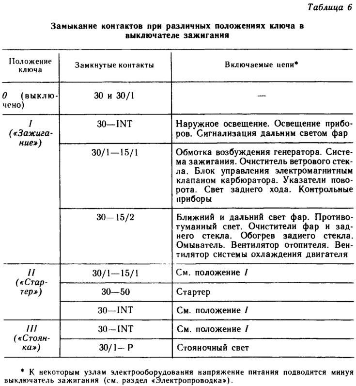 Контактная часть выключателя зажигания неразборная. Напряжение от аккумуляторной батареи и генератора подводится к контактам «30» и «30/1». В табл. 6 показано, какие контакты выключателя замыкаются при различных положениях ключа.