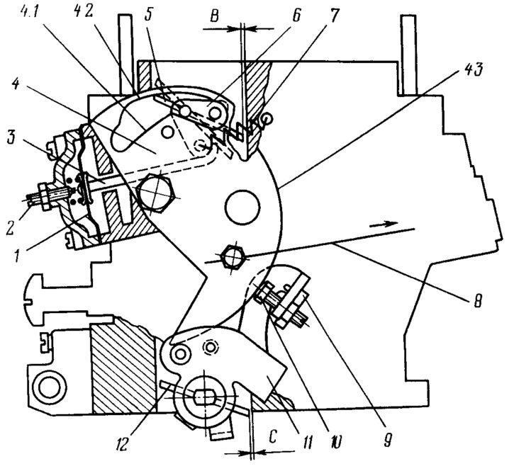 1 - диафрагма; 2 - регулировочный винт; 3 - шток диафрагмы; 4 - рычаг управления воздушной заслонкой; 4.1 - нижний профиль паза рычага 4 для ограничения максимального приоткрывання воздушной заслонки; 4.2 - верхний профиль паза, обеспечивающий механическое открытие воздушной заслонки; 4.3 - кромка рычага 4 для обеспечения пускового зазора дроссельной заслонки первой камеры; 5 - воздушная заслонка; 6 - рычаг воздушной заслонки; 7 - возвратная пружина воздушной заслонки; 8 - тяга рукоятки привода воздушной заслонки; 9 - стопор регулировочного винта; 10 - регулировочный винт приоткрывания дроссельной заслонки первой камеры; 11 - рычаг управления дроссельными заслонками; 12 - дроссельная заслонка первой камеры.