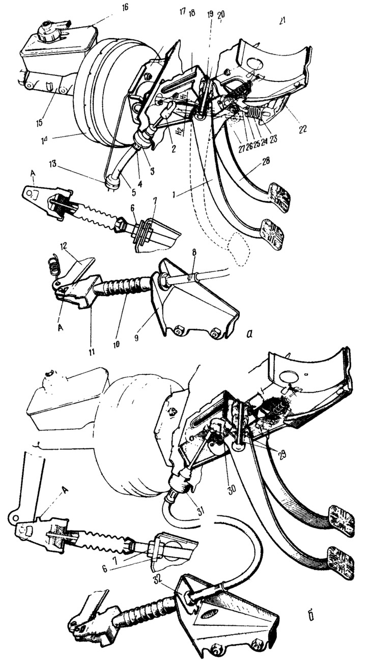 а) с сервомеханизмом; б) беззазорного типа; 1 - педаль сцепления; 2 - серьга педали; 3 - резиновый буфер; 4 - верхний наконечник оболочки троса; 5 - оболочка троса; 6, 7 - регулировочные гайки; 8 - нижний наконечник оболочки троса; 9 - кронштейн крепления нижнего наконечника оболочки троса; 10 - защитный чехол; 11 - поводок троса; 12 - рычаг вилки выключения сцепления; 13 - втулка оттяжного крючка; 14 - вакуумный усилитель; 15 - главный цилиндр; 16 - бачок; 17 - кронштейн крепления вакуумного усилителя; 18 - кронштейн педалей сцепления и тормоза; 19 - стопорная скоба; 20 - ось педалей; 21 - оттяжная пружина педали тормоза; 22 - кронштейн сервомеханизма; 23 - опора пружины сервомеханизма; 24 - пружина сервомеханизма; 25 - упорная шайба толкателя сервомеханизма; 26 - толкатель; 27 - дистанционная втулка; 28 - педаль тормоза; 29 - втулки педали сцепления; 30 - оттяжная пружина педали сцепления; 31 - обойма; 32 - фиксирующая пластина; А - усик.
