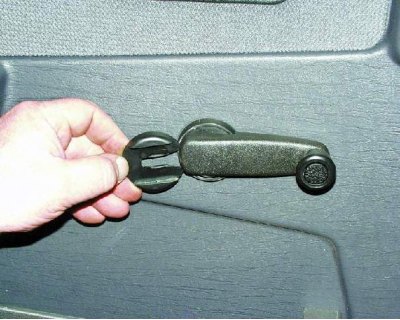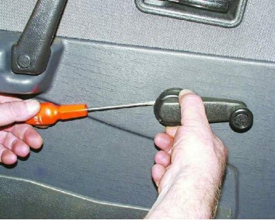 1. Вставьте тонкую отвертку между розеткой и облицовкой ручки стеклоподъемника. Отжав розетку отверткой, сдвиньте облицовку так, чтобы выступ на ней (см. примечание) вышел из зацепления с розеткой.