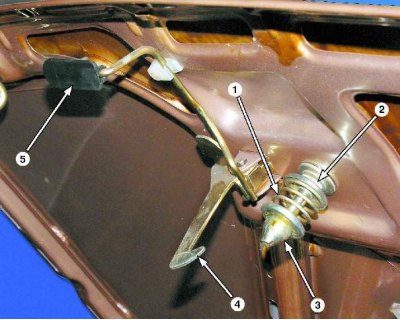 1 - пружина защелки; 2 - контргайка; 3 - защелка; 4 - предохранительный крючок; 5 - ручка предохранительного крючка
