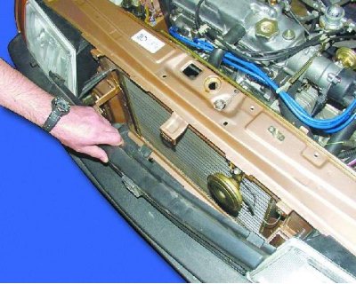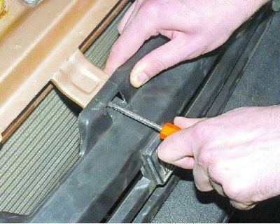 3. Поверните облицовку на себя и снимите ее, выведя пластмассовые крючки из кронштейнов на кузове. Установите новую облицовку в порядке, обратном снятию.