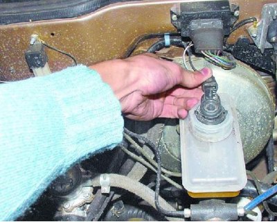 1. Отсоедините колодку с проводами от датчика уровня тормозной жидкости, установленного в крышке бачка.
