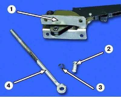 1 – рычаг стояночного тормоза; 2 – ось тяги; 3 – стопорное кольцо; 4 – тяга