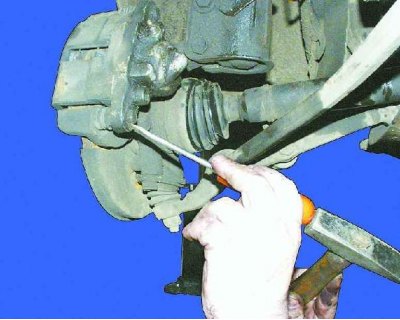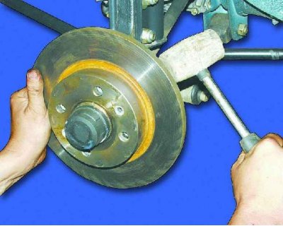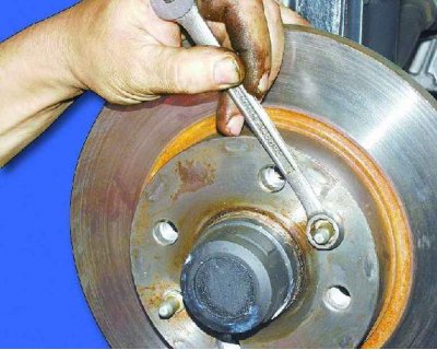 Внимание! Затормозите автомобиль стояночным тормозом и установите под задние колеса упорные бруски. Поднимите и установите на опоры переднюю часть автомобиля. Снимите колесо.