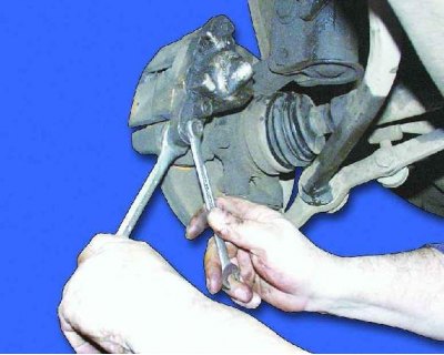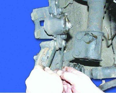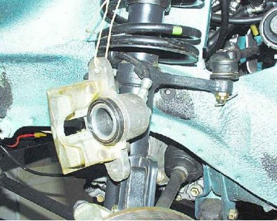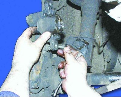 5. Подвесьте суппорт с колесным цилиндром на проволоке к пружине передней подвески. При этом следите, чтобы тормозной шланг не перекручивался и не был сильно натянут.