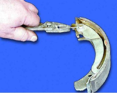 11. Снимите заднюю колодку, отсоединив приводной рычаг от наконечника троса стояночного тормоза.