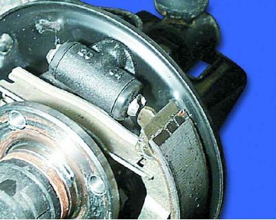Примечание. При замене колодок также осмотрите тормозной барабан. Замерьте штангенциркулем диаметр рабочей поверхности барабана. Предельно допустимый диаметр барабана 201,5 мм. Если диаметр равен или больше предельно допустимого, замените барабан. При наличии рисок барабан можно расточить до диаметра 201 мм. Рекомендуется одновременно заменять барабаны с обеих сторон.