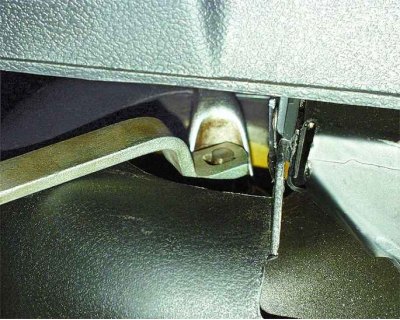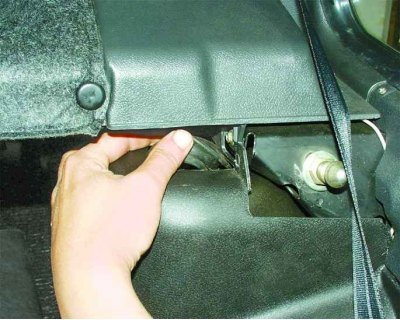 1. Опустите спинку заднего сиденья, снимите защитный колпак верхнего крепления стойки, находящийся под задней полкой.