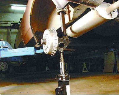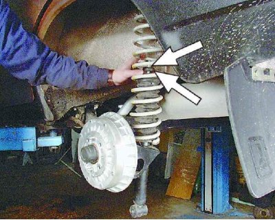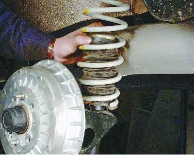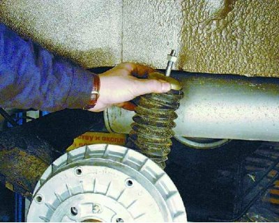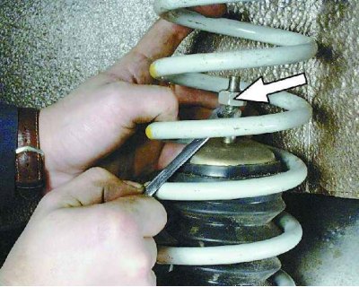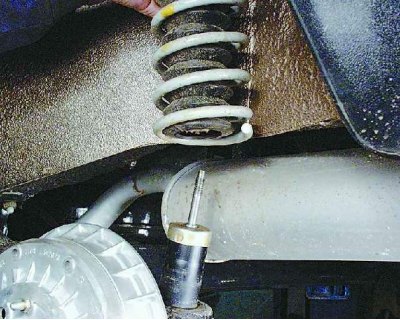 14. Чтобы сжать пружину при установке стойки, подставьте домкрат под балку. Постепенно приподнимая балку домкратом и сжимая тем самым пружину, введите шток амортизатора в отверстие арки кузова.