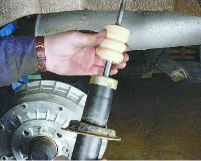 5. Опустите стойку вниз и снимите со штока амортизатора нижнюю подушку с опорной шайбой и распорной втулкой через витки пружины.