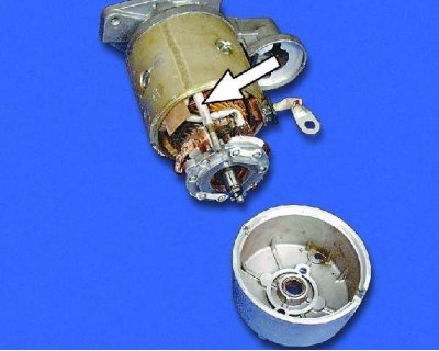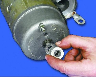 7. Подбором регулировочных шайб отрегулируйте осевой зазор вала якоря стартера. Зазор должен быть не более 0,5 мм.