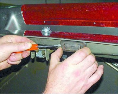 1. Подцепите отверткой и сдвиньте фонарь вправо, чтобы вывести из зацепления крючок на корпусе.