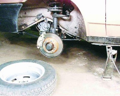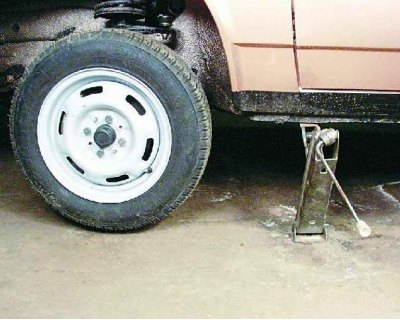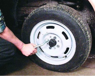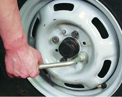 4. С помощью домкрата слегка приподнимите автомобиль, но так, чтобы колесо, требующее замены, не отрывалось от дороги. Снимите декоративный колпак (если он есть) и баллонным ключом ослабьте четыре болта крепления колеса. Очаровательным дамам советуем для облегчения этой операции приобрести специальный баллонный ключ с телескопической рукояткой.