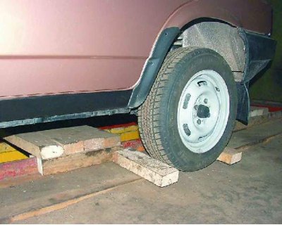 3. С противоположной стороны автомобиль нужно зафиксировать, подложив под переднее и заднее колеса противооткатные упоры так, чтобы поднятый автомобиль не мог сместиться вперед или назад.