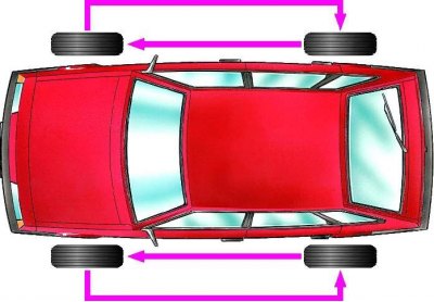 Периодически проверяйте давление воздуха в шинах. Повышенное или пониженное давление приводит к преждевременному износу шин, ухудшаются управляемость и устойчивость. Чтобы шины изнашивались равномерно, через каждые 30 000 км пробега переставляйте колеса в соответствии со схемой. Также через каждые 30 000 км пробега отбалансируйте колеса и отрегулируйте углы установки передних колес. Для этого обратитесь в специализированную мастерскую.
