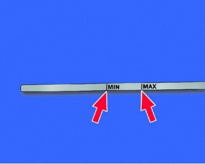 2. Выньте указатель (щуп). Уровень масляной пленки должен находиться между метками "MIN" и "MAX". Если уровень масла приближается к метке "MIN" или ниже ее, долейте масло.