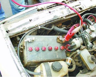1. Подсоедините красный провод к клемме "+" заряженной аккумуляторной батареи (на другом автомобиле).