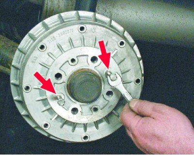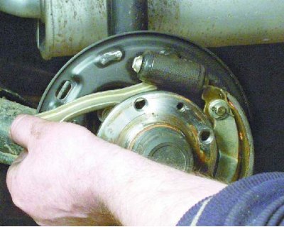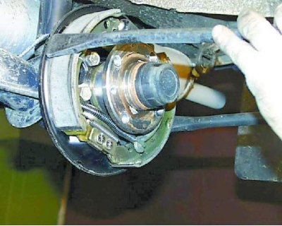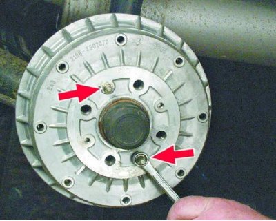 2. Снимите тормозной барабан. Если возникли трудности со снятием, вверните два болта М8 в резьбовые отверстия барабана и спрессуйте его, равномерно ввертывая болты.