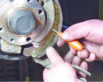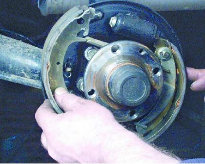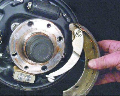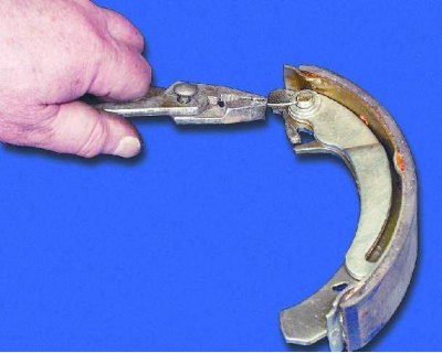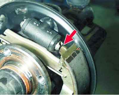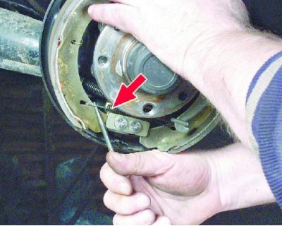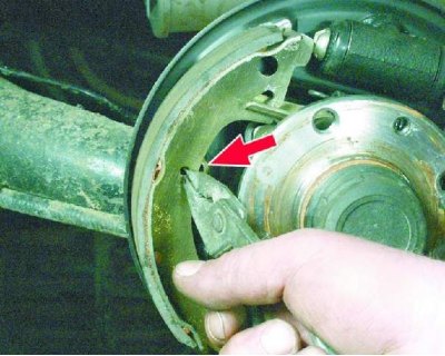 9. Снимите заднюю колодку, отсоединив приводной рычаг от наконечника троса стояночного тормоза.