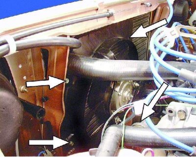 6. Отверните два болта и две гайки крепления кожуха электровентилятора.