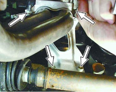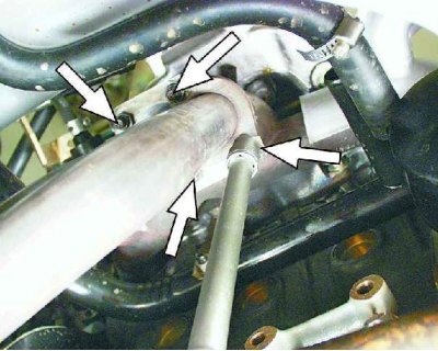 4. Отверните четыре гайки крепления приемной трубы к выпускному коллектору.