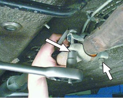 2. Отверните две гайки крепления приемной трубы к кронштейну под днищем автомобиля. Затем отверните два болта крепления кронштейна к кузову и снимите кронштейн.