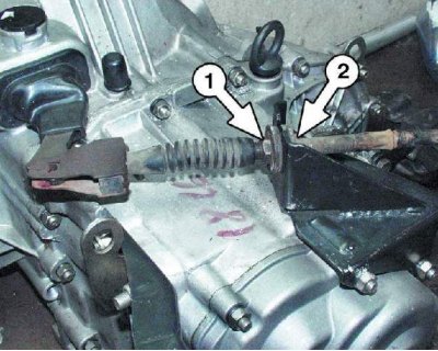 1 - обойма оболочки троса; 2 - трос привода сцепления; 3 - регулировочные гайки