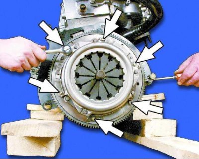 Примечание 1. При отворачивании болтов крепления кожуха сцепления заблокируйте маховик с помощью отвертки. Для упора отвертки установите болт.